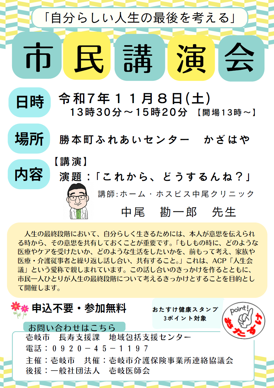 人生の最終段階において、自分らしく生きるためには、本人が意思を伝えられる時から、その意思を共有しておくことが重要です。「もしもの時に、どのような医療やケアを受けたいか、どのような生活をしたいかを、前もって考え、家族や医療・介護従事者と繰り返し話し合い、共有すること。」これは、ACP「人生会議」という愛称で親しまれています。この話し合いのきっかけを作るとともに、市民一人ひとりが人生の最終段階について考えるきっかけとすること目的として開催します。